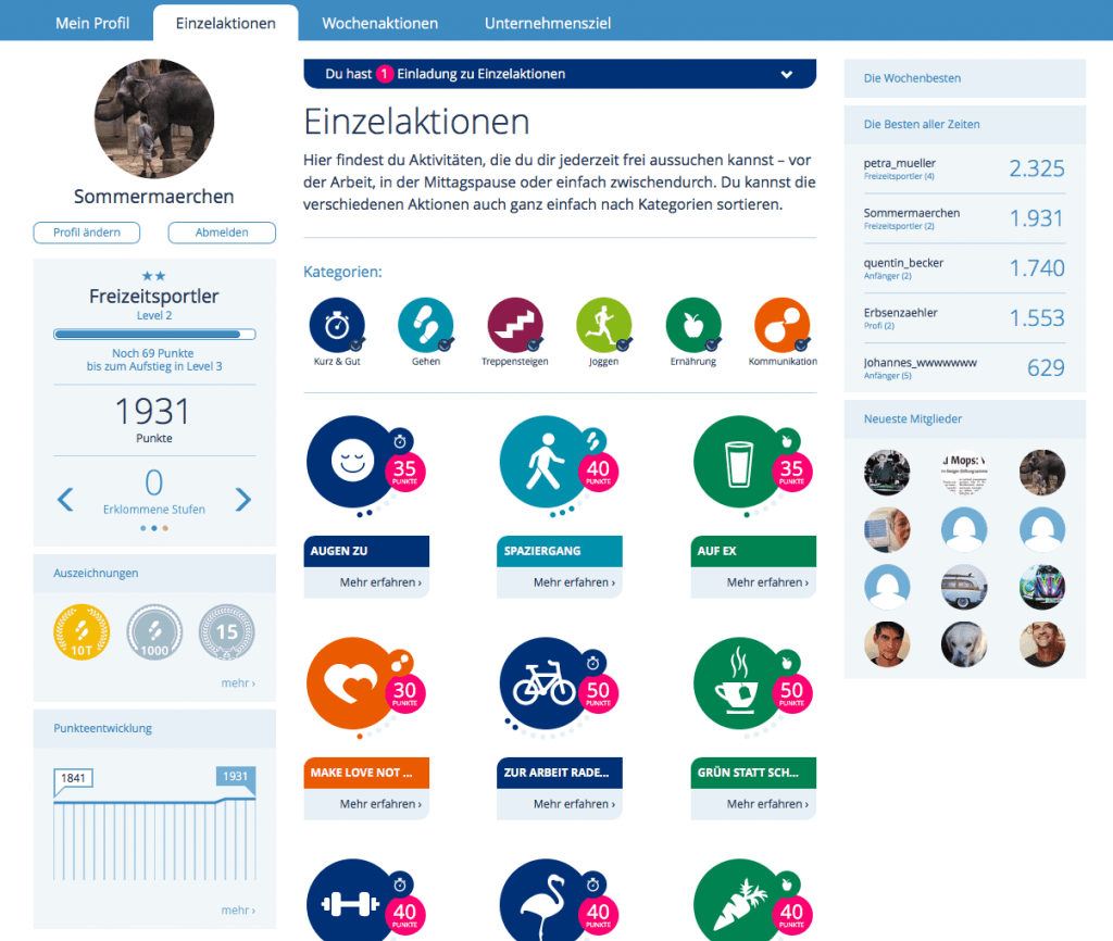 Mitarbeiter wählen wöchentlich bzw. täglich neue Aufgaben, die überall im Betrieb umsetzbar sind., z.b. Treppensteigen anstatt den Fahrstuhl zu benutzen. für jede Aktivität erhält der Teilnehmer wie aus Gamification bekannt Punkte und Auszeichnungen. Diese werden auf der digitalen Plattform für ihn und sein Team sichtbar gemacht. Er kann seinen Fitnesszuwachs sehen und es entsteht eine Rangliste, wenn gewünscht. Bei einer bestimmten Punktzahl erreicht der Teilnehmer eine höhere Stufe.
