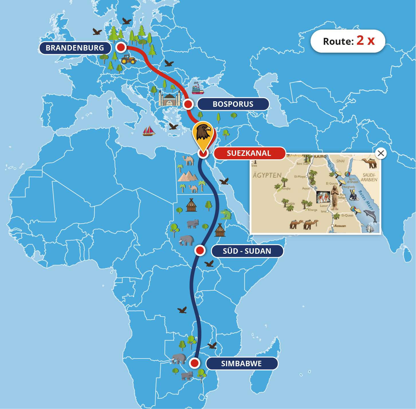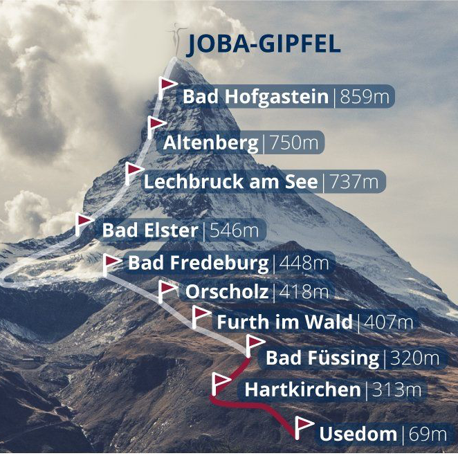 Sie wählen in der Basis-Version eine der 4 Hauptbilder für eine virtuelle Strecke aus. Sie haben die Wahl zwischen einer Strecke von A nach B, einer Rundstrecke, der Reise um die Welt oder möchten Sie und Ihre Mitarbeiter einen Gipfel besteigen. Die Ortsnamen und Bilder werden Ihren Wünschen entsprechend angepasst.