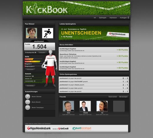Bei kickbook.de gewinnt der Einzelne, wenn die Mannschaft gewinnt und die Mannschaft, wenn sich der Einzelne engagiert. Siege auf Fußballplätzen geben genauso Punkte wie Spiele in der digitalen Welt von kickbook.de. Gewinnen wird am Ende aber das Team, das nicht nur gut kickt, sondern sich darüber hinaus auch Spielpunkte durch Integrationsmaßnahmen sichert. Zum Beispiel bei gemeinsamen Sprachkursen, Reparaturen für einen besseren Bolzplatz oder durch einen guten Mannschaftsgeist.